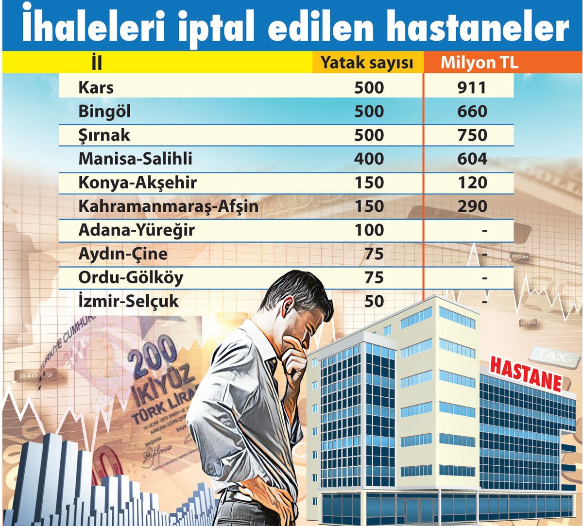 Kamu İhale bülteninde yer alan bilgilere göre Sağlık Bakanlığı’na bağlı Sağlık Yatırımları Genel Müdürlüğü tarafından yapılması planlanan ve toplam 2 bin 500 yatak kapasiteli 10 devlet hastanesi; Kars, Bingöl, Şırnak, Manisa, Konya, Kahramanmaraş, Adana, Aydın, Ordu ve İzmir illerinde bulunuyor. Müteahhitlerin yaklaşık değerleri az bulmaları nedeniyle ihaleler şimdilik iptal edildi.