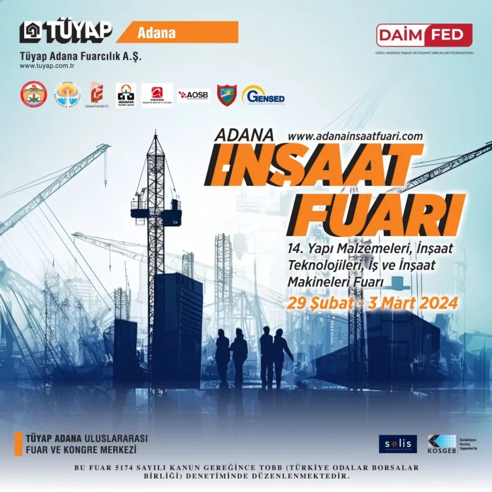 TÜYAP Fuarcılık Grubu ve DAİMFED (Doğu Akdeniz İnşaat Müteahhitleri Birlikleri Federasyonu) iş birliğinde 5 yıl aradan sonra profesyonel ziyaretçiyi tek bir çatı altında toplayan TÜYAP Adana İnşaat Fuarı 29 Şubat- 3 Mart 2024 tarihleri arasında Adana’da büyük bir fuar ile bir araya gelmeye hazırlanıyor.