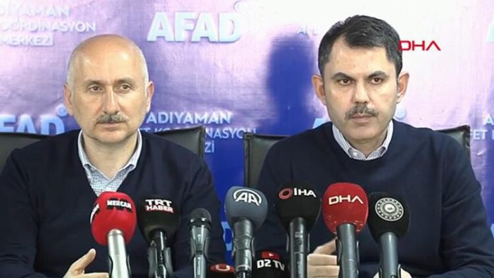 Ulaştırma Bakanı Adil Karaismailoğlu ile birlikte açıklamalarda bulunan Çevre, Şehircilik ve İklim Değişikliği Bakanı Murat Kurum, Adıyaman’da yeni yerleşim yerlerinin belirlendiğini belirtirken ayrıca, ‘Tüm illerimizde 604 bin 856 bölümden oluşan 212 bin binanın acil yıkılacak, yıkık, ağır hasarlı olduğu tespitini yaptık.’ dedi. Kurum, “13 bin 987 köy inşa evi yapacağız. Arazisi uygunsa arazisine, uygun değilse mera arazilerine yapılacak. İnşallah 2 ay içinde 11 ilde 244 bin konutun temellerini atacağız” dedi.