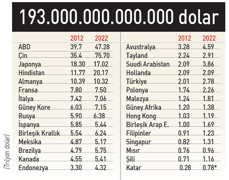 Ülkelerin istatistik kurumlarından toplanan verilere göre 2022'de ABD, 'gayrimenkul kralı' unvanını Çin'e kaptıracak. Çin'deki inşaat aktifleri ise 40 trilyon artarak 75.7 trilyon dolar olacak. ABD ise 47 trilyon dolarla ikinciliğe gerileyecek. Avrupa 7'ncisi Türkiye, 2022'de Hollanda'yı geride bırakarak 6'ncılığa yükselecek. Türkiye'deki inşaat aktifleri 10 yılda yüzde 40 artarak 2.8 trilyon dolara çıkacak. (sabah)