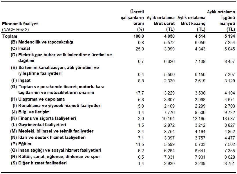 K (Finans ve sigorta faaliyetleri) sektörü, 13 587 TL ile aylık ortalama işgücü maliyetinin en yüksek olduğu sektör oldu. Bu sektörü, 9 732 TL ile J (Bilgi ve iletişim) ve 8 628 TL ile R (Kültür, sanat, eğlence, dinlence ve spor) sektörleri izledi. I (Konaklama ve yiyecek hizmeti faaliyetleri) sektörü ise 2 703 TL ile aylık ortalama işgücü maliyetinin en düşük olduğu sektör oldu. Bu sektörü 3 129 TL ile F (İnşaat) ve 3 751 TL ile S (Diğer hizmet faaliyetleri) sektörleri takip etti.