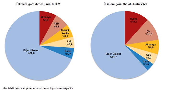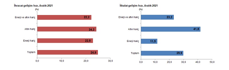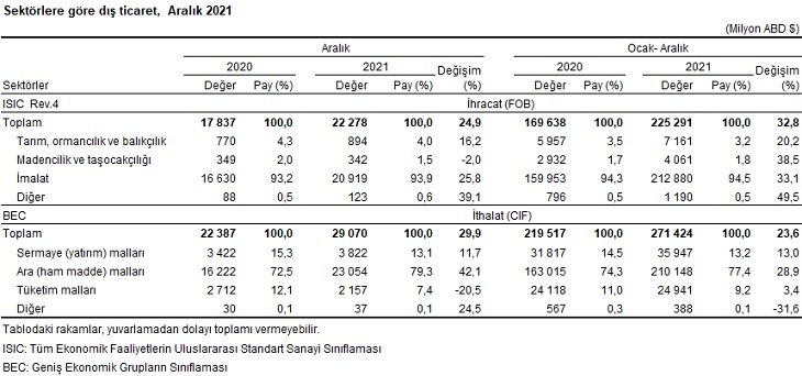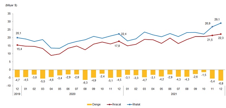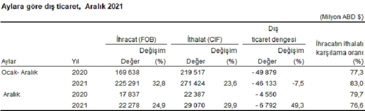 Türkiye İstatistik Kurumu ile Ticaret Bakanlığı iş birliğiyle oluşturulan genel ticaret sistemi kapsamında üretilen geçici dış ticaret verilerine göre; ihracat 2021 yılı Aralık ayında, bir önceki yılın aynı ayına göre %24,9 artarak 22 milyar 278 milyon dolar, ithalat %29,9 artarak 29 milyar 70 milyon dolar olarak gerçekleşti.
