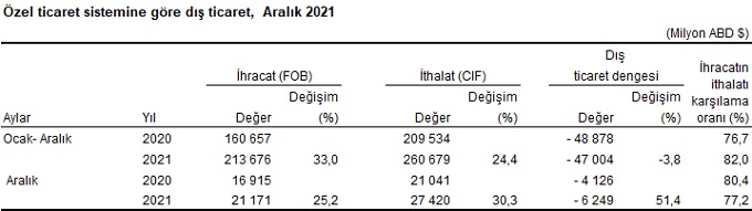 Özel ticaret sistemine göre, 2021 yılı Aralık ayında, ihracat bir önceki yılın aynı ayına göre %25,2 artarak 21 milyar 171 milyon dolar, ithalat %30,3 artarak 27 milyar 420 milyon dolar olarak gerçekleşti.