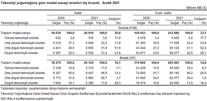 Teknoloji yoğunluğuna göre dış ticaret verileri, ISIC Rev.4 sınıflaması içinde yer alan imalat sanayi ürünlerini kapsamaktadır. Aralık ayında ISIC Rev.4’e göre imalat sanayi ürünlerinin toplam ihracattaki payı %93,9’dur. Yüksek teknoloji ürünlerinin imalat sanayi ürünleri ihracatı içindeki payı %3,6’dır. Ocak-Aralık döneminde ISIC Rev.4’e göre imalat sanayi ürünlerinin toplam ihracattaki payı %94,5’dir. Ocak-Aralık döneminde yüksek teknoloji ürünlerinin imalat sanayi ürünleri ihracatı içindeki payı %3,0’dır.