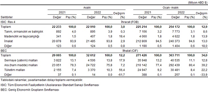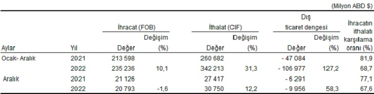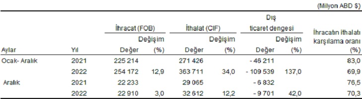 Türkiye İstatistik Kurumu ile Ticaret Bakanlığı iş birliğiyle genel ticaret sistemi kapsamında üretilen geçici dış ticaret verilerine göre; ihracat 2022 yılı Aralık ayında, bir önceki yılın aynı ayına göre %3,0 artarak 22 milyar 910 milyon dolar, ithalat %12,2 artarak 32 milyar 612 milyon dolar olarak gerçekleşti.