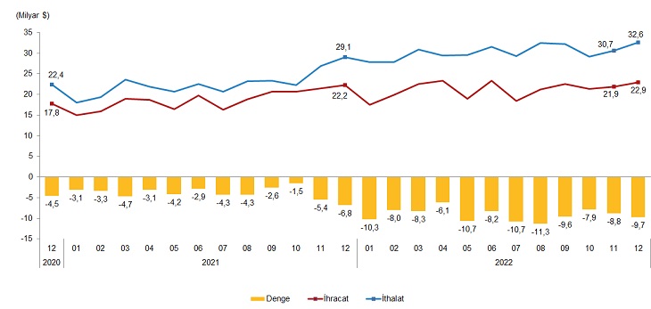 Aralık ayında dış ticaret açığı bir önceki yılın aynı ayına göre %42,0 artarak 6 milyar 832 milyon dolardan, 9 milyar 701 milyon dolara yükseldi. İhracatın ithalatı karşılama oranı 2021 Aralık ayında %76,5 iken, 2022 Aralık ayında %70,3’e geriledi.