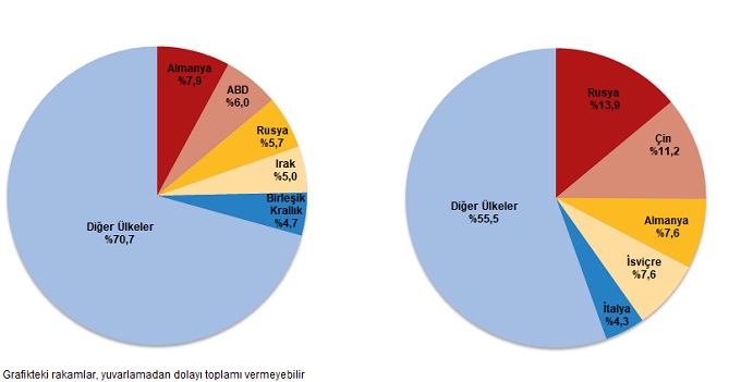 Ocak-Aralık döneminde ithalatta ilk sırayı Rusya Federasyonu aldı. Rusya Federasyonu’ndan yapılan ithalat 58 milyar 853 milyon dolar olurken, bu ülkeyi sırasıyla; 41 milyar 354 milyon dolar ile Çin, 24 milyar 33 milyon dolar ile Almanya, 15 milyar 335 milyon dolar ile İsviçre, 15 milyar 229 milyon dolar ile ABD izledi. İlk 5 ülkeden yapılan ithalat, toplam ithalatın %42,6’sını oluşturdu.