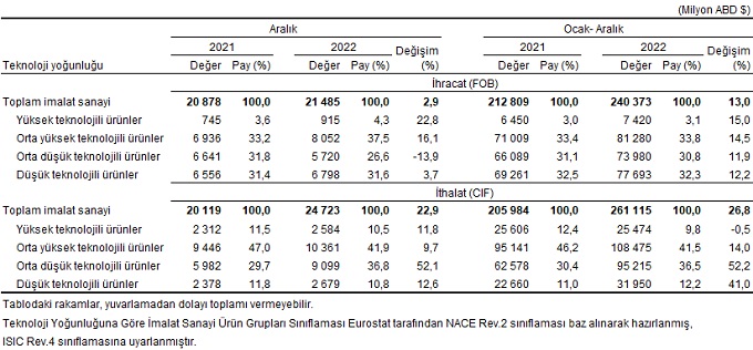 Teknoloji yoğunluğuna göre imalat sanayi ürünleri dış ticareti, Aralık 2022