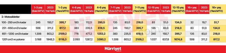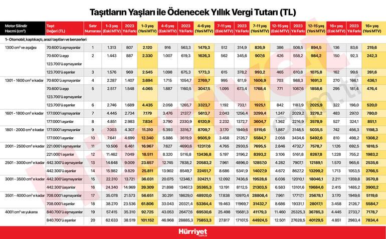 - 1.300 silindir hacminin altında 1-3 yaş aralığındaki otomobiller 2 bin 120 lira,