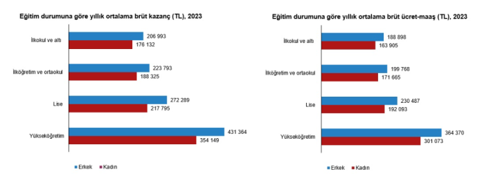 Kazanç düzeylerinin hem erkeklerde hem de kadınlarda eğitim durumu ile birlikte yükseldiği görüldü. Eğitim durumuna göre en yüksek yıllık ortalama brüt kazancı yükseköğretim eğitim düzeyine sahip olanlar elde etti. Bu eğitim düzeyinde yıllık ortalama brüt kazanç erkeklerde 431 bin 364 TL, kadınlarda ise 354 bin 149 TL oldu.