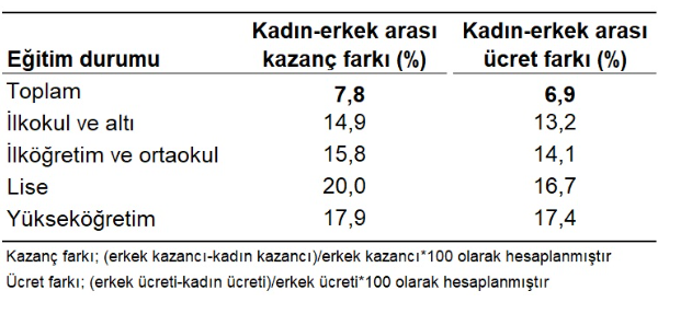 Yıllık ortalama brüt kazanç ile hesaplanan gösterge için en yüksek fark %20,0 ile lise mezunlarında, en düşük fark ise %14,9 ile ilkokul ve altı mezunlarda gerçekleşti. Yıllık ortalama brüt ücret-maaş ile hesaplanan gösterge için ise en yüksek fark %17,4 ile yükseköğretim mezunlarında, en düşük fark %13,2 ile yine ilkokul ve altı mezunlarda gerçekleşti.