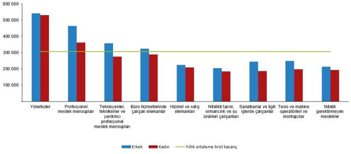 En yüksek yıllık ortalama brüt kazancı 538 bin 530 TL ile yöneticiler meslek grubunda çalışanlar elde etti. Bu meslek grubunu 409 bin 767 TL ile profesyonel meslek mensupları izledi. En düşük yıllık ortalama brüt kazanç ise 202 bin 809 TL ile nitelikli tarım, ormancılık ve su ürünleri çalışanları grubunda gerçekleşti.