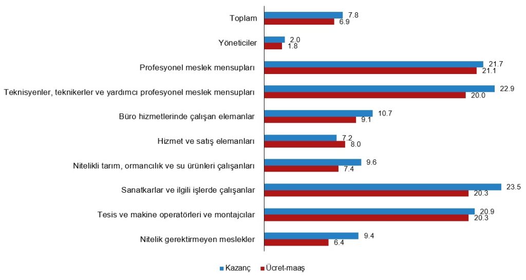 Kadın-erkek arası kazanç farkının en yüksek olduğu meslek grupları; %23,5 ile sanatkârlar ve ilgili işlerde çalışanlar ve %22,9 ile teknisyenler, teknikerler ve yardımcı profesyonel meslek mensupları olmuştur. En düşük olduğu meslek grupları ise %2,0 ile yöneticiler ve %7,2 ile hizmet ve satış elemanlarıdır.