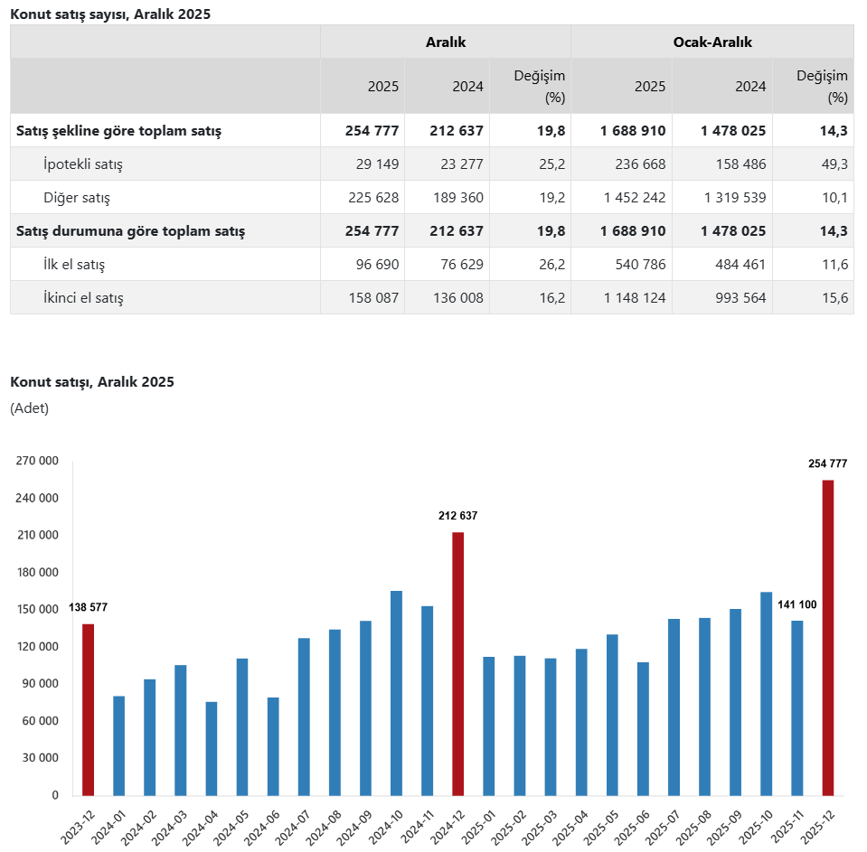 Türkiye İstatistik Kurumu (TÜİK) Aralık ayı ve 2025 yılı Konut Satış İstatistiklerini açıkladı. Buna göre, aralık ayında 254 bin 777 adet konut satılırken yılın tamamında satılan konut sayısı  bir önceki seneye göre %14,3 oranında artarak 1 milyon 688 bin 910 oldu.