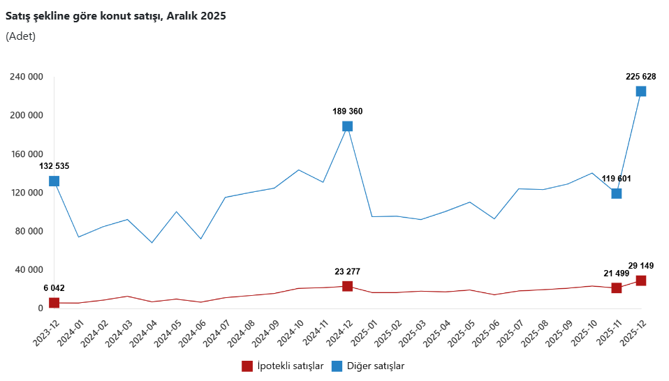 Türkiye genelinde diğer konut satışları Aralık ayında bir önceki yılın aynı ayına göre %19,2 oranında artarak 225 bin 628 oldu. 2025 yılında gerçekleşen diğer konut satışları ise bir önceki yıla göre %10,1 oranında artarak 1 milyon 452 bin 242 oldu.