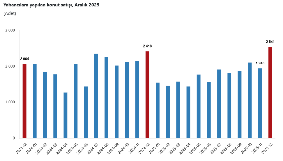 Yabancılara Aralık ayında 2 bin 541 konut satışı gerçekleşti
