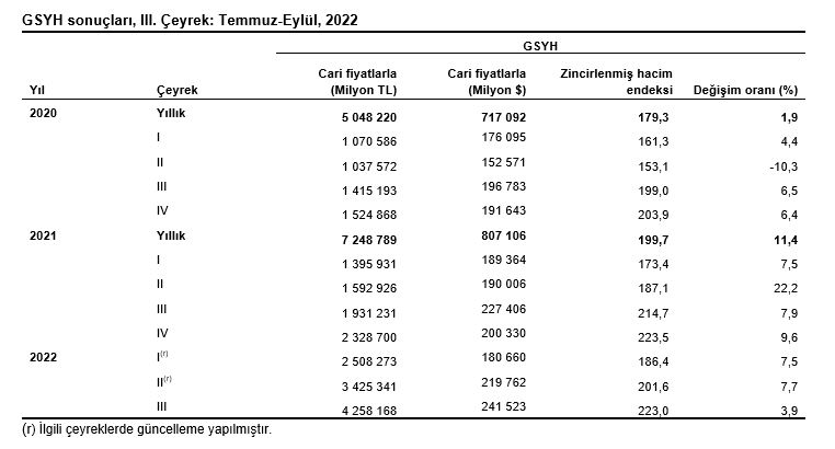 Üretim yöntemiyle Gayrisafi Yurt İçi Hasıla tahmini, 2022 yılının üçüncü çeyreğinde cari fiyatlarla bir önceki yılın aynı çeyreğine göre %120,5 artarak 4 trilyon 258 milyar 168 milyon TL oldu. GSYH’nin üçüncü çeyrek değeri cari fiyatlarla ABD doları bazında 241 milyar 523 milyon olarak gerçekleşti.