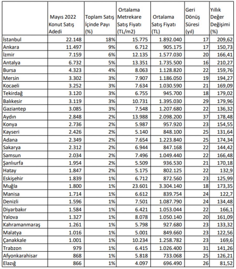 Mayıs ayında en çok konut satışının olduğu ilk 30 il değerlendirildiğinde yıllık değer artışı en yüksek olan iller ise sırasıyla Antalya, İstanbul ve Mersin oldu.