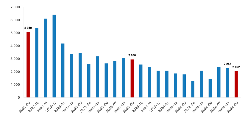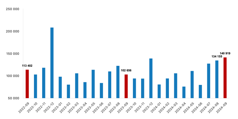 Türkiye genelinde konut satışları Eylül ayında bir önceki yılın aynı ayına göre %37,3 oranında artarak 140 bin 919 oldu. Konut satış sayısının en fazla olduğu iller sırasıyla 21 bin 314 ile İstanbul, 13 bin 205 ile Ankara ve 7 bin 612 ile İzmir olurken, en az olduğu iller sırasıyla 74 ile Hakkari, 82 ile Ardahan ve 106 ile Bayburt olarak gerçekleşti.