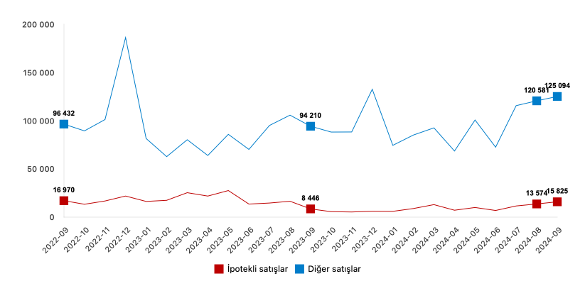 Türkiye genelinde ipotekli konut satışları Eylül ayında bir önceki yılın aynı ayına göre %87,4 oranında artarak 15 bin 825 oldu. Toplam konut satışları içinde ipotekli satışların payı %11,2 olarak gerçekleşti. Ocak-Eylül döneminde gerçekleşen ipotekli konut satışları ise bir önceki yılın aynı dönemine göre %42,6 oranında azalarak 92 bin 310 oldu.
