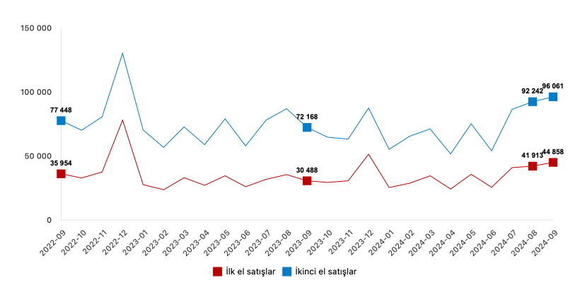 Türkiye genelinde ikinci el konut satış sayısı Eylül ayında bir önceki yılın aynı ayına göre %33,1 oranında artarak 96 bin 61 oldu. Toplam konut satışları içinde ikinci el konut satışının payı %68,2 oldu. İkinci el konut satışları Ocak-Eylül döneminde ise bir önceki yılın aynı dönemine göre %2,4 oranında artarak 646 bin 357 olarak gerçekleşti.