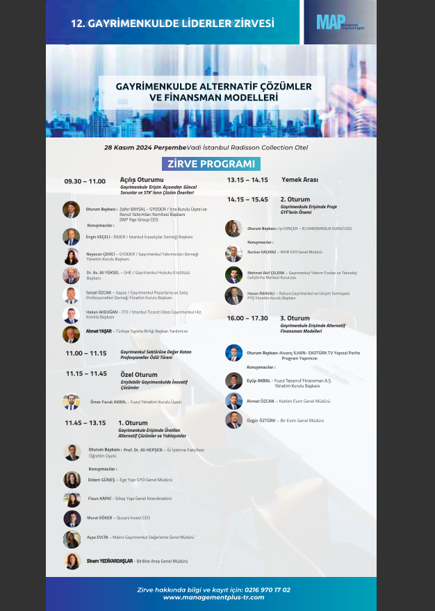 Gayrimenkule erişebilme ile ilgili alternatif çözümler ve finansman modelleri dahil olmak üzere, sektöre ilişkin tüm olumlu ve olumsuz süreçleri ele alarak bir yol haritası oluşturabilmek amacıyla, bu yıl zirvenin 12. si 28 Kasım 2024 Perşembe günü düzenlenecek.