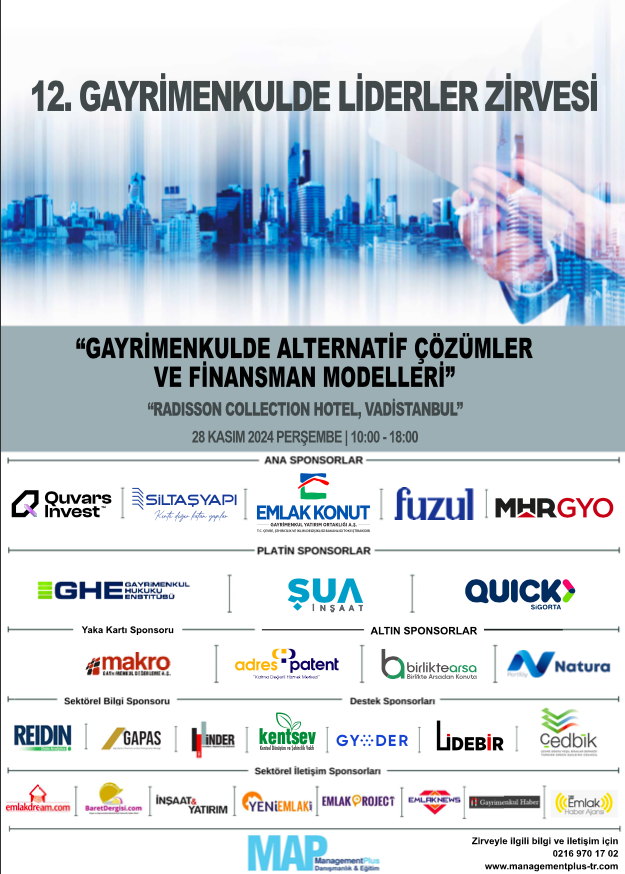 2012 yılından bu yana Management Plus Danışmanlık ve Eğitim tarafından her yıl organize edilen “Gayrimenkulde Liderler Zirvesi” bu yıl 12. kez Radisson Collection Hotel Vadi İstanbul’ da düzenlenecek.
