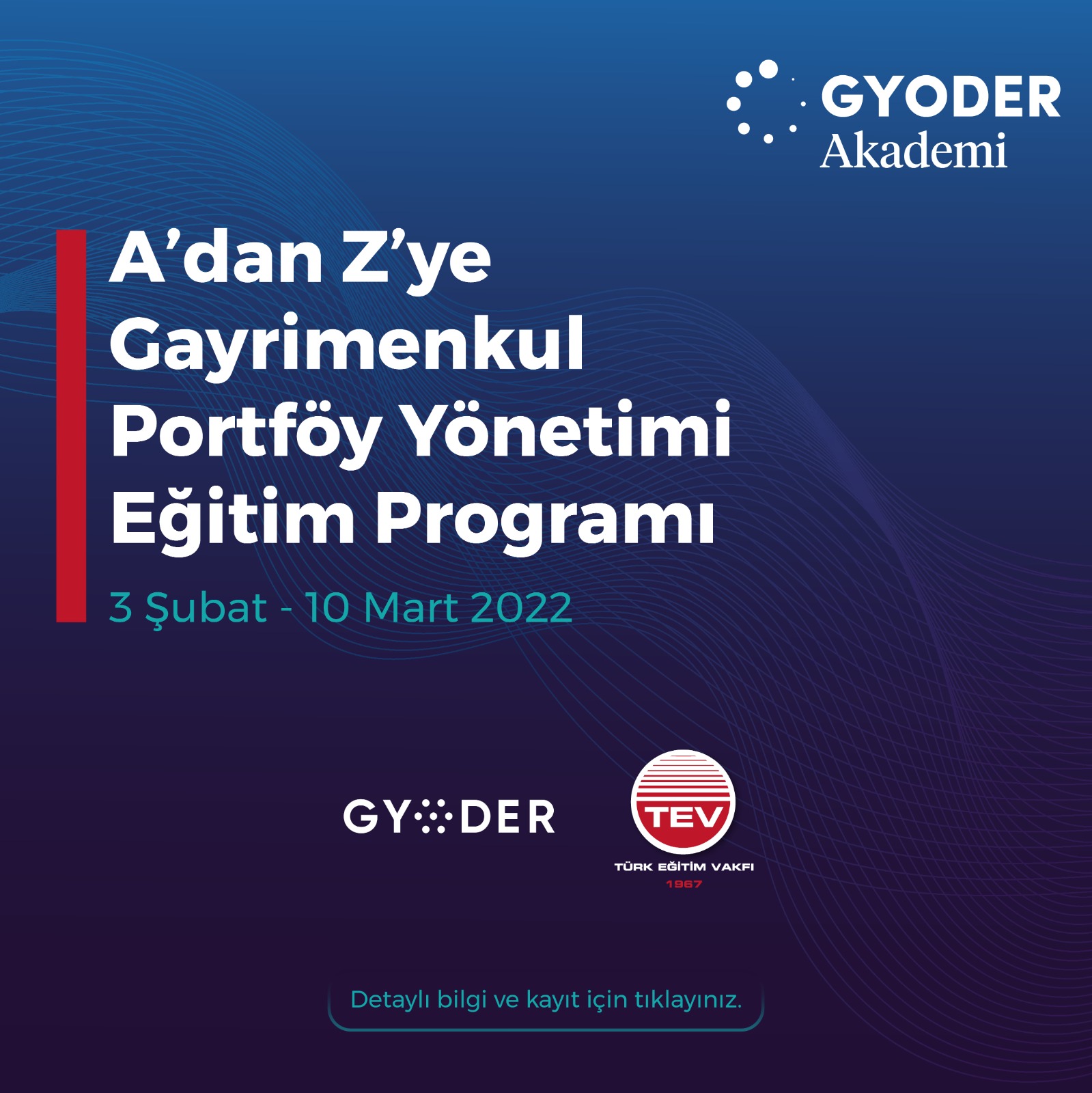 Türkiye’nin Gayrimenkul Platformu GYODER, sektöre değer katan seminer programlarına, gayrimenkul portföy yönetimi konusu ile devam ediyor. GYODER Akademi ve Türk Eğitim Vakfı (TEV) işbirliği ile hayata geçirilen  “A’dan Z’ye Gayrimenkul Portföy Yönetimi” eğitim programı, 3 Şubat Perşembe günü başlayacak. Programda Gayrimenkul Portföyü Varlık Yönetimi, Hukuki Alt Yapı Yönetimi, Teknoloji Yönetimi; Gayrimenkul Proje Geliştirme Süreçleri, Yatırım ve Proje Finansman Yönetimi, Entegre Bütçe & Gider & Tasarruf Yönetimi; Satış & Pazarlama & PR Yönetimi ve Portföy Yönetiminde Sürdürülebilirlik gibi birçok konu, sektörün önemli eğitimcileri ve deneyimli isimleri tarafından ele alınacak.