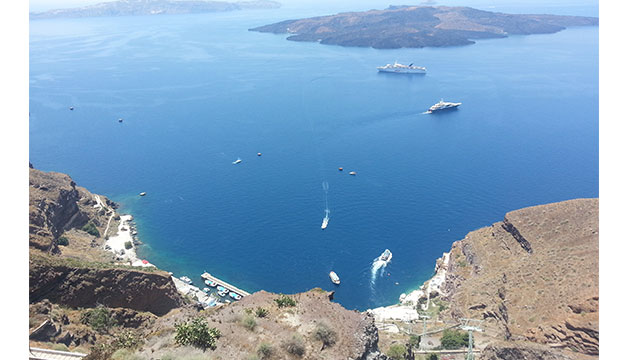 Ada volkanik olduğu için gemilerin kıyıya yanaşmasına izin verilmiyor. Zaten dik yamaçlardan kayalar düşmesin diye de ayrıca file yapmışlar. Bizim gemimiz de açıklarda demir attı ve ufak motorlarla adaya ulaştık. Adaya ulaştığımızda ilk gittiğimiz yer Hz. İlyas’ın kilisesi oldu. Büyük otobüslerle buraya çıkarken oldukça dik ve dar yamaçlardan geçerken biraz ürkebilirsiniz. Ayrıca belirtmek gerekir ki bu oldukça ufak kilisenin bulunduğu nokta adanın en yüksek noktası ve panoramik olara tüm adanın görülebileceği tek yer. Oldukça kurak olan bu adada yılın 320 günü hava güneşliymiş bu yüzden panoramik fotoğraflarda da fazla yeşillik beklemeyin.