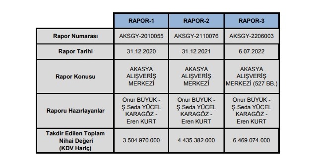 Akasya AVM’nin aynı şirket tarafından hazırlanan son 3 yıllık yeniden değerlendirme tablosu şöyle: