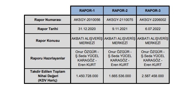 Akbatı AVM’nin aynı şirket tarafından hazırlanan son 3 yıllık yeniden değerlendirme tablosu şöyle: