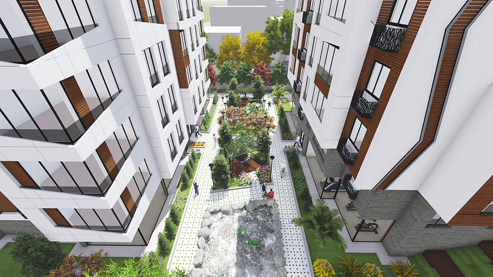 - Peyzajlı yeşil alanlar, yürüme yolları, dinlenme alanları, süs havuzu