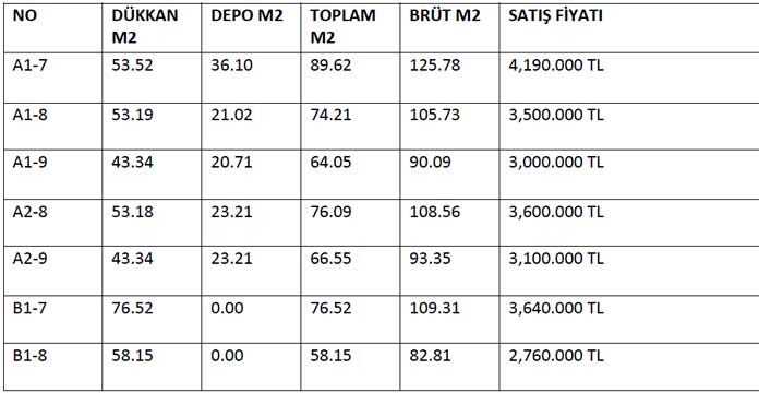 Projedeki dükkanların listesi ve güncel satış fiyatları şöyle: