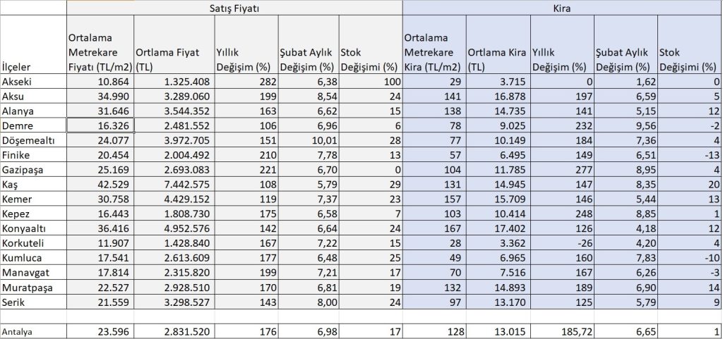Antalya’da Şubat ayında satılık konut stoku %17 artarken, kiralık konut stoku %1 artış gösterdi, ortalama kira 13 bin 015 TL, ortalama satış fiyatı ise 2 milyon 831 bin 520 TL oldu. Antalya’da kiralık konut stokunun en fazla düşüş gösterdiği ilçeler Finike ve Kumluca oldu.