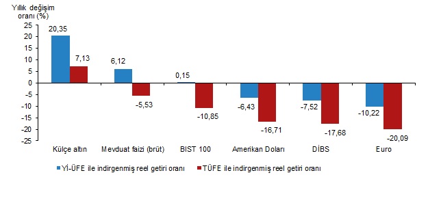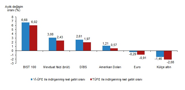Yİ-ÜFE ile indirgendiğinde; yatırım araçlarından mevduat faizi (brüt) %3,08, Devlet İç Borçlanma Senetleri (DİBS) %2,61 ve Amerikan Doları %1,21 oranlarında yatırımcısına reel getiri sağlarken; Euro %0,29 ve külçe altın %1,46 oranlarında yatırımcısına kaybettirdi. TÜFE ile indirgendiğinde; mevduat faizi (brüt) %2,43, DİBS %1,97 ve Amerikan Doları %0,57 oranlarında yatırımcısına reel getiri sağlarken; Euro %0,91 ve külçe altın %2,08 oranlarında yatırımcısına kaybettirdi.
