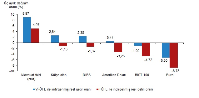 Mevduat faizi (brüt), üç aylık değerlendirmede; Yİ-ÜFE ile indirgendiğinde %8,97, TÜFE ile indirgendiğinde ise %4,97 oranlarında yatırımcısına en yüksek reel getiri sağlayan yatırım aracı oldu. Aynı dönemde Euro, Yİ-ÜFE ile indirgendiğinde %5,30, TÜFE ile indirgendiğinde ise %8,78 oranlarında yatırımcısına en çok kaybettiren yatırım aracı oldu.