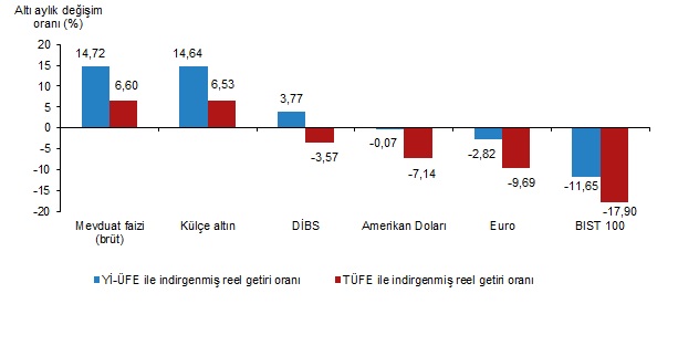 Altı aylık değerlendirmeye göre mevduat faizi (brüt); Yİ-ÜFE ile indirgendiğinde %14,72, TÜFE ile indirgendiğinde ise %6,60 oranlarında yatırımcısına en yüksek reel getiri sağlayan yatırım aracı olurken; aynı dönemde BIST 100 endeksi, Yİ-ÜFE ile indirgendiğinde %11,65, TÜFE ile indirgendiğinde ise %17,90 oranlarında yatırımcısına en çok kaybettiren yatırım aracı oldu.