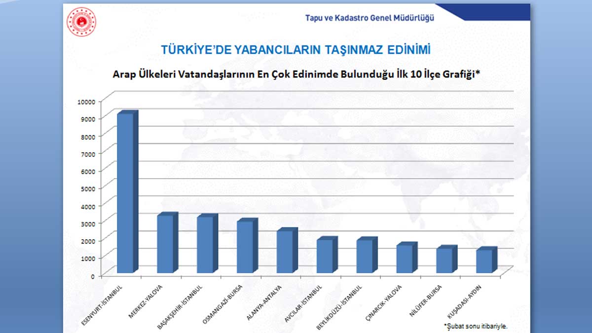Arap yatırımcıların en çok konut aldıkları ilçeler sıralamasında ise 9 bine yaklaşan taşınmaz sayısıyla İstanbul’un Esenyurt ilçesi başı çekiyor. Bu ilçeyi sırasıyla, Yalova merkez ilçesi, İstanbul Başakşehir, Bursa Osmangazi, Antalya Alanya, İstanbul Avcılar, İstanbul Beylikdüzü, Yalova Çınarcık, Bursa Nilüfer ve Aydın’ın Kuşadası ilçeleri takip ediyor.
