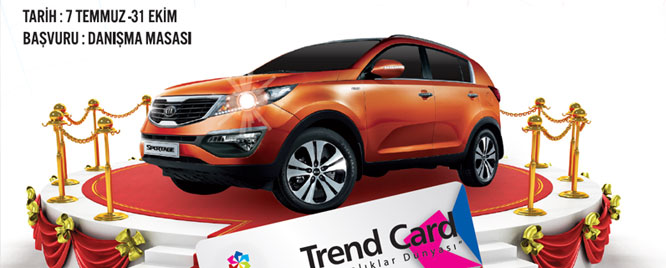 ArenaPark’ın ‘Yeni trend, Yeni sportage’ kampanyasına katılmak için Trend Card sahibi olmak gerekiyor. ArenaPark’ın alışveriş kartı olan Trend Card’a Danışma Masası’na başvurarak ücretsiz sahip olunabiliyor. Trend Card ile 7 Temmuz-31 Ekim tarihleri arasında toplamda 50 lira ve üzeri alışveriş yapan herkes kampanyaya katılabiliyor.