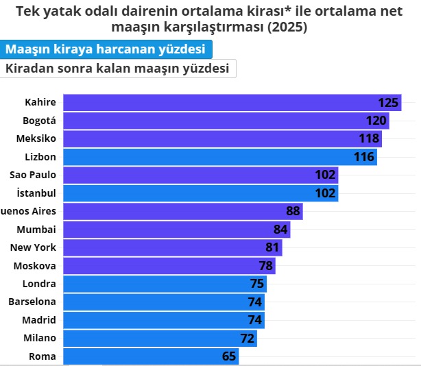 EKOTÜRK’ün haberine göre 46 dünya şehrinin karşılaştırıldığı çalışmada İstanbul, maaş-kira dengesine göre 41. sırada konumlandı. İstanbul ile birlikte Sao Paulo, Lizbon, Meksiko City, Bogota ve Kahire de maaşların kiraya yetmediği şehirler arasında yer aldı. Bu şehirlerde yaşam maliyeti, özellikle konut harcamaları açısından ciddi bir yük oluşturuyor.