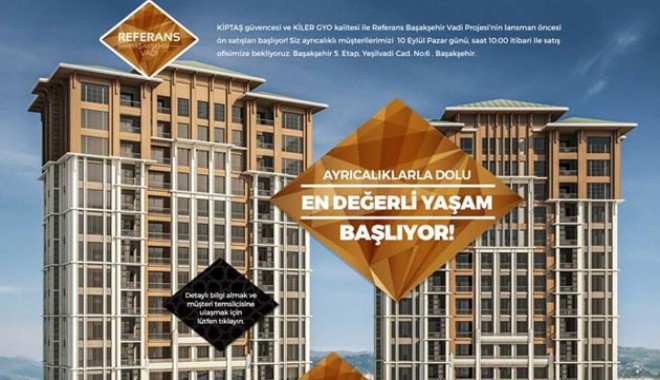 Referans Başakşehir Vadi projesi Kiptaş güvencesinde Kiler GYO tarafından 8 dönümlük arsa üzerine inşa ediliyor. 87 konuttan oluşan projede toplam 68 ticari ünite bulunuyor.