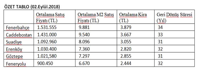 Metrekare satış fiyatı 7.360 TL, konut fiyatı 1.030.400 TL, kiralar 2.820 TL, geri dönüş süresi 32 yıl.