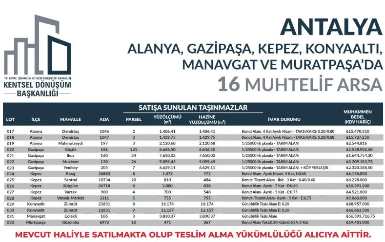 Çevre, Şehircilik ve İklim Değişikliği Bakanlığı Antalya’nın 6 farklı ilçesinde yer alan 16 parseli satış listesine ekledi.