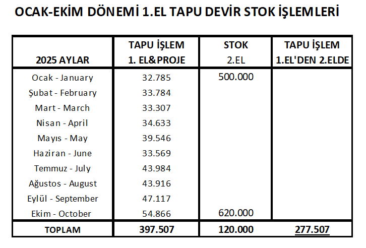 Bu durum, 2025 yılı Ocak – Ekim döneminde Birinci El pazarında satılan 397.507 adet – 120.000 adet = 277.507 adet konutun 2.el’de tekrar satılmıştır.
