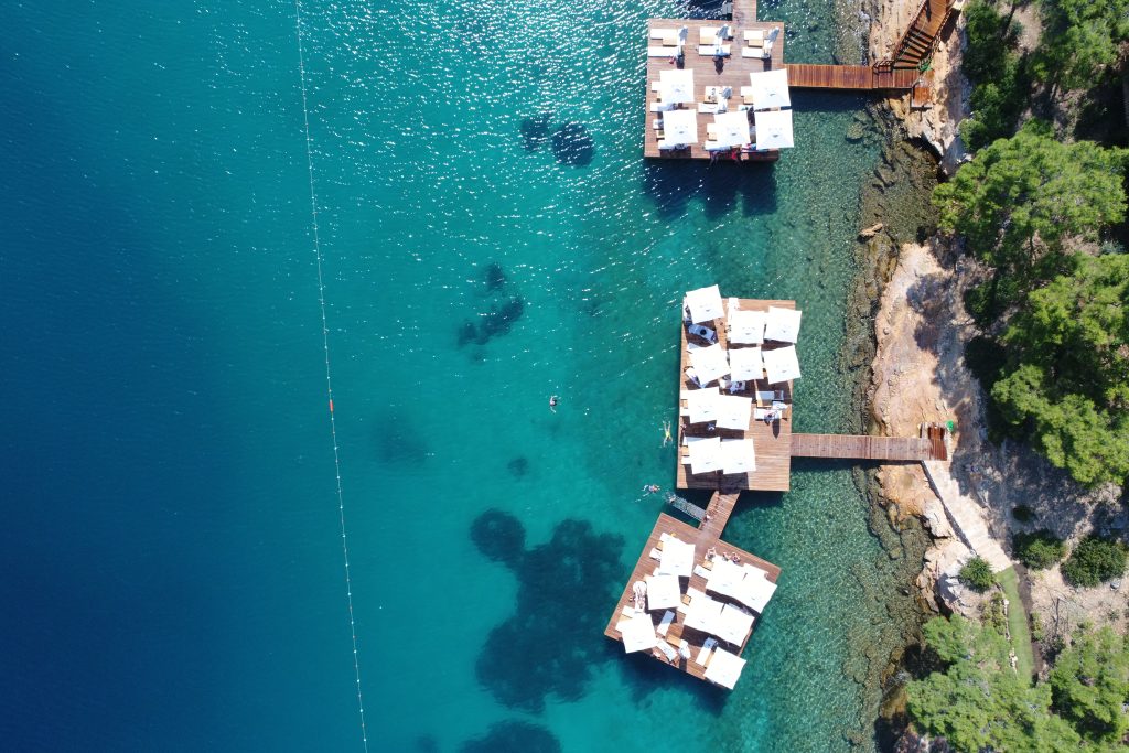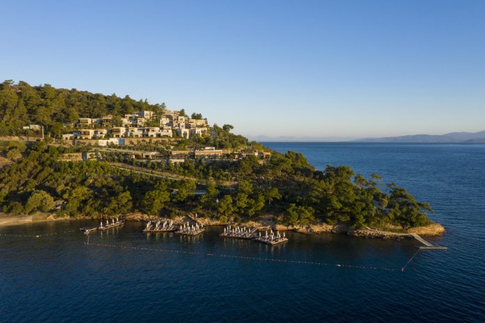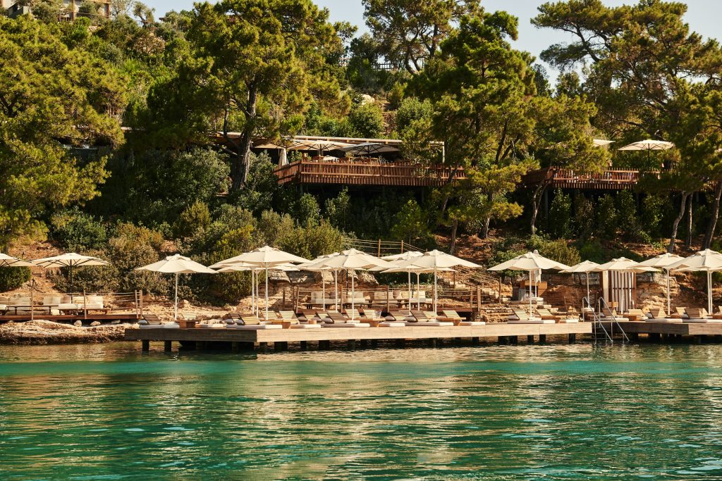 “Sandal, çam, zeytin ve narenciye ağaçlarıyla kaplı bir tepeye taşınmış bir köy gibi hissettiren bir otel düşünün; elbette geceleri ağaçları peri ışıklarıyla aydınlatılan bir köy. Bu huzurlu sığınak, çoğunlukla tek katlı villalardan oluşuyor ve minimalist bir havası var. Ve iki yerleşik restorandan sadece kısa bir yürüyüş mesafesinde: Ege yemekleri sunan Loft Elia (domates salatası ve levrek inanılmaz); ve Boğaziçi’nden esinlenen süper şık Paper Moon. Otelin bulunduğu dik yamaçtan, sevimli sürücülerle dolu buggyler sizi villanızdan denize götürüyor, burada güneşlenme yatakları ve şemsiyeleri olan ahşap güverte, suya inen basamaklar, geçen yatların manzaraları ve buz kovalarında içecekler bulunuyor. Hem rahat hem de mükemmeliyetçi olan bu yer, ev yapımı pizzadan ve pastaneden, sayısız yıldız seyretme noktasına aile dostu bir Türk lezzeti sunuyor.”