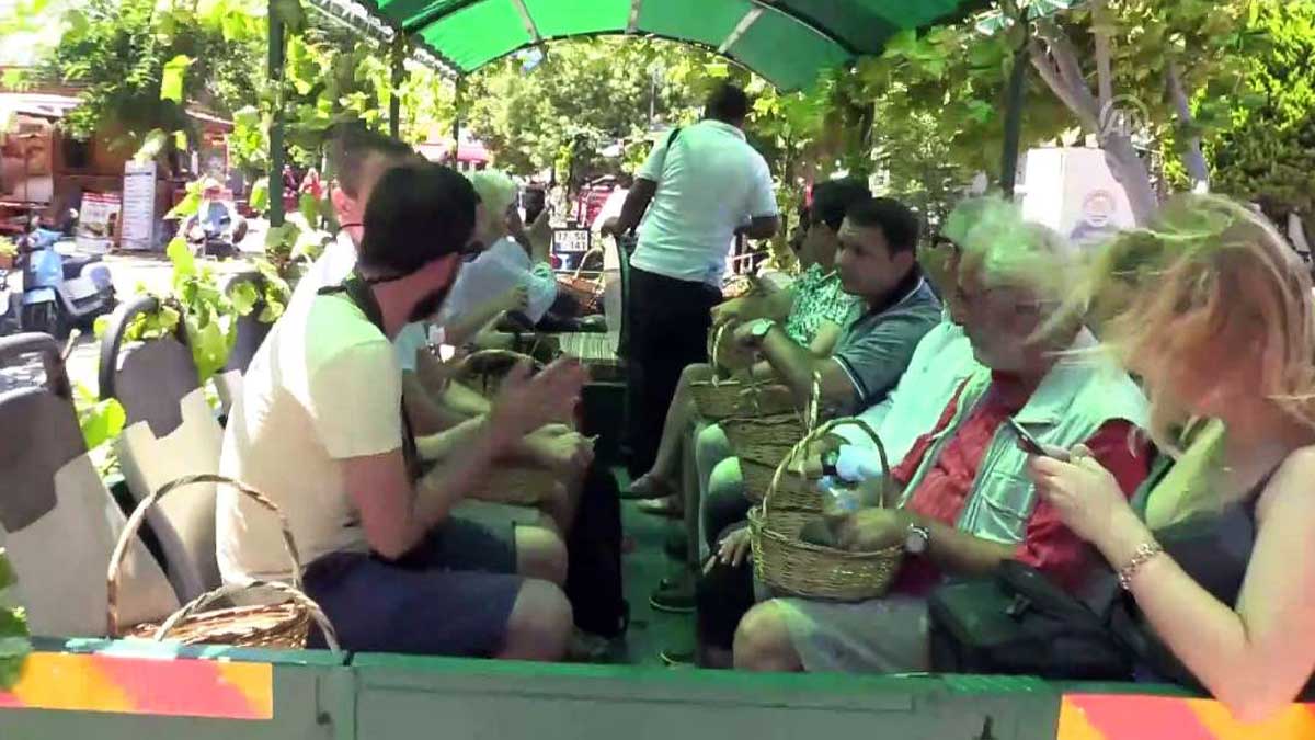 Çanakkale’ye bağlı Bozcaada’ya eylül ayı başından bu yana üzüm bağı turları düzenleniyor. Adaya gelen turistler traktörlere bağlı römorklarla üzüm bağlarına götürülüyor. Bu yolculuk esnasında davullu, klarnetli müzisyenler de yol boyunca çalgılı çengili kendilerine eşlik ediyor.