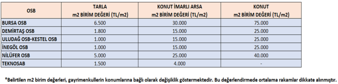Çevresindeki yapılaşmanın değer üzerinde olumlu etkisi bulunan OSB’lerin bulunduğu bölgelerdeki arsa, tarla ve konut birim değerlerine ilişkin yaklaşık fiyatlar aşağıdaki tabloda gösterilmiştir.”