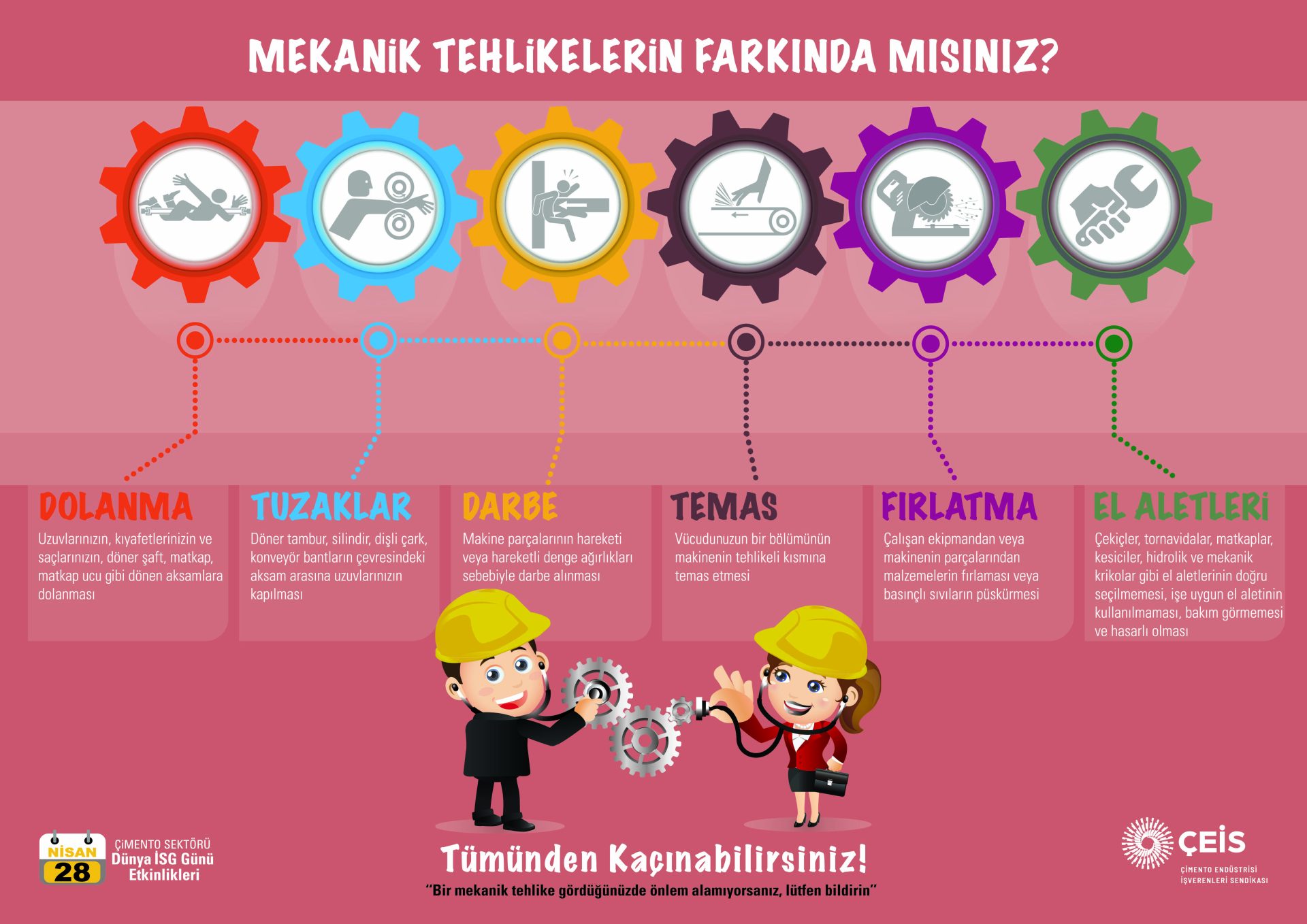 Çimento sektöründe faaliyet gösteren şirketlerin tamamına yakınının üyesi olduğu ÇEİS, 8 yıldır aralıksız sürdürdüğü 28 Nisan Dünya İş Sağlığı ve Güvenliği Günü etkinliklerini bu yıl “Mekanik Tehlikeler” teması kapsamında gerçekleştirdi. Nisan ayı boyunca, “Mekanik Tehlikelerin Farkındayım, İş Kazalarına Karşı Bir Adım Öndeyim” sloganı ve Türkiye’nin 7 bölgesinden toplam 17.500 sayıda çalışanın katılımıyla düzenlenen etkinliklerde, fabrikalardaki mekanik tehlikelere karşı farkındalık geliştirildi ve çözüm yolları arandı.