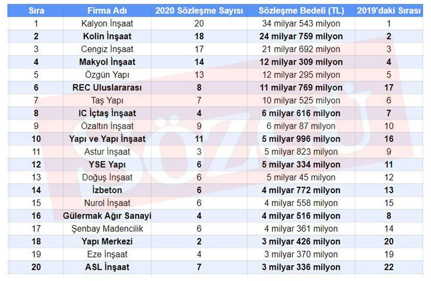 Kalyon İnşaat’ı 18 sözleşme karşılığında 24 milyar 759 liralık sözleşme tutarıyla Kolin İnşaat, 17 sözleşme karşılığında 21 milyar 692 milyon lira ile Cengiz İnşaat izledi.