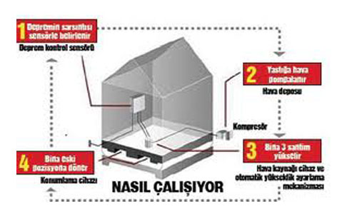 Sistem, yer sarsıntısının durduğunu belirlediğinde hava yastıkları içindeki hava boşaltıyor ve bina tekrar temellerine oturuyor.